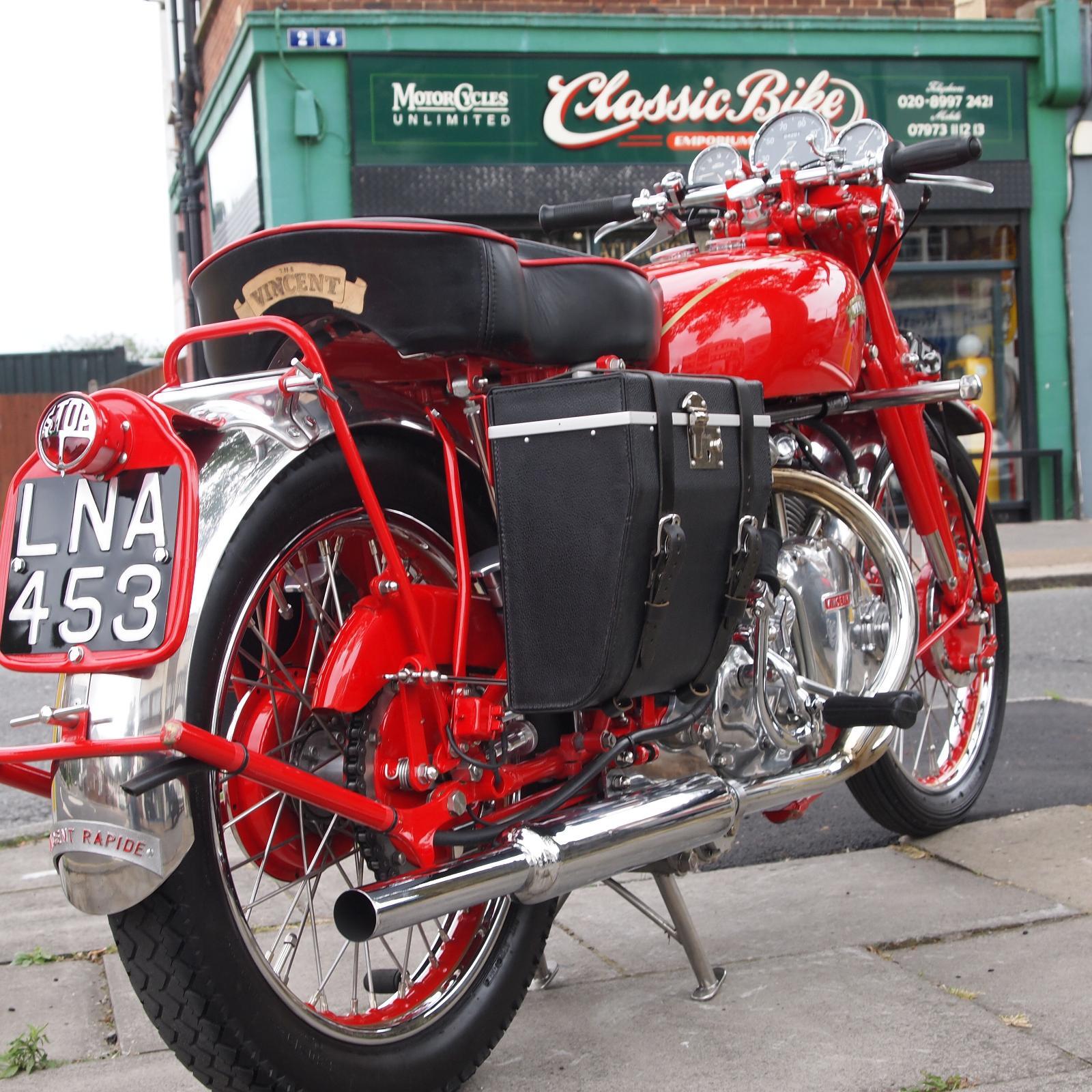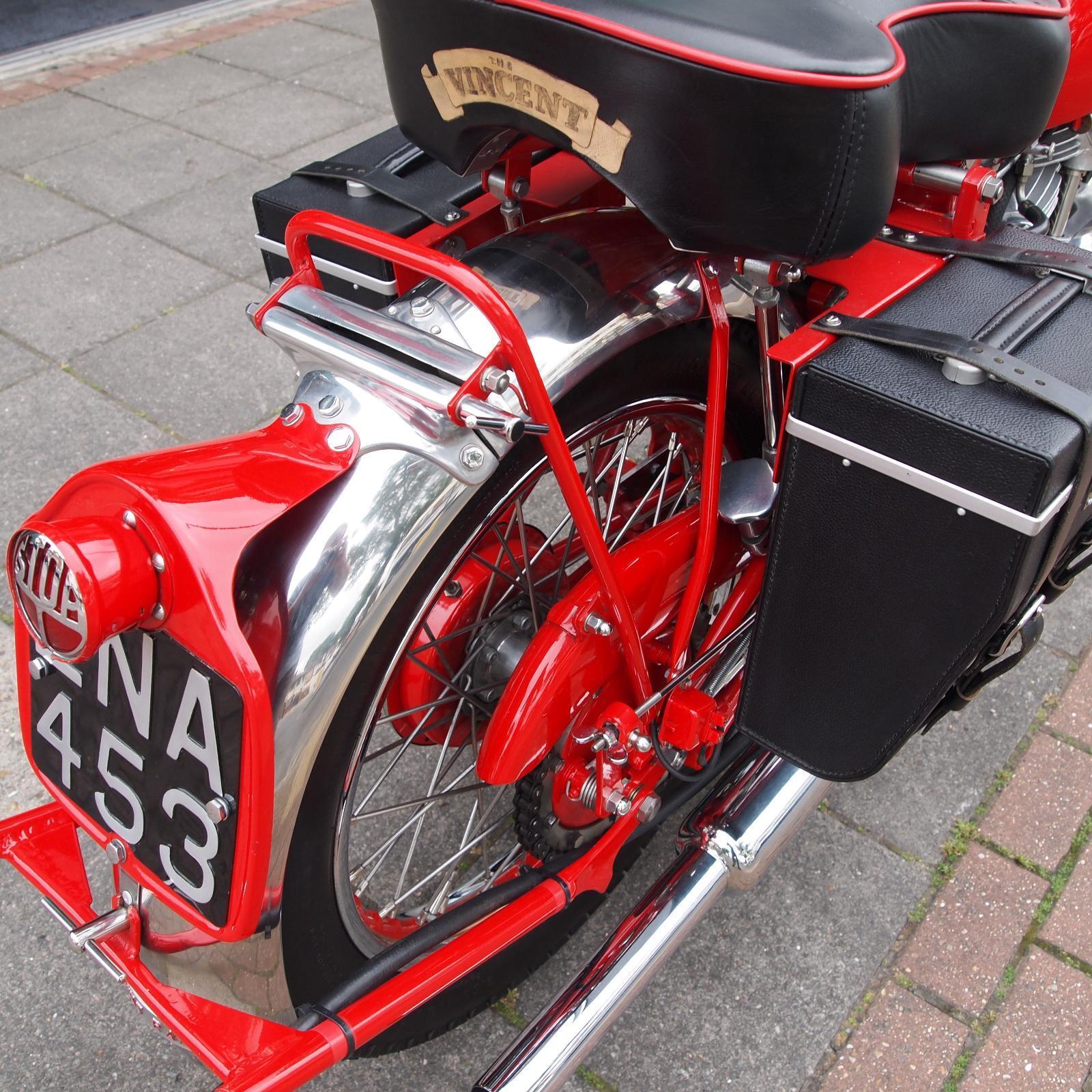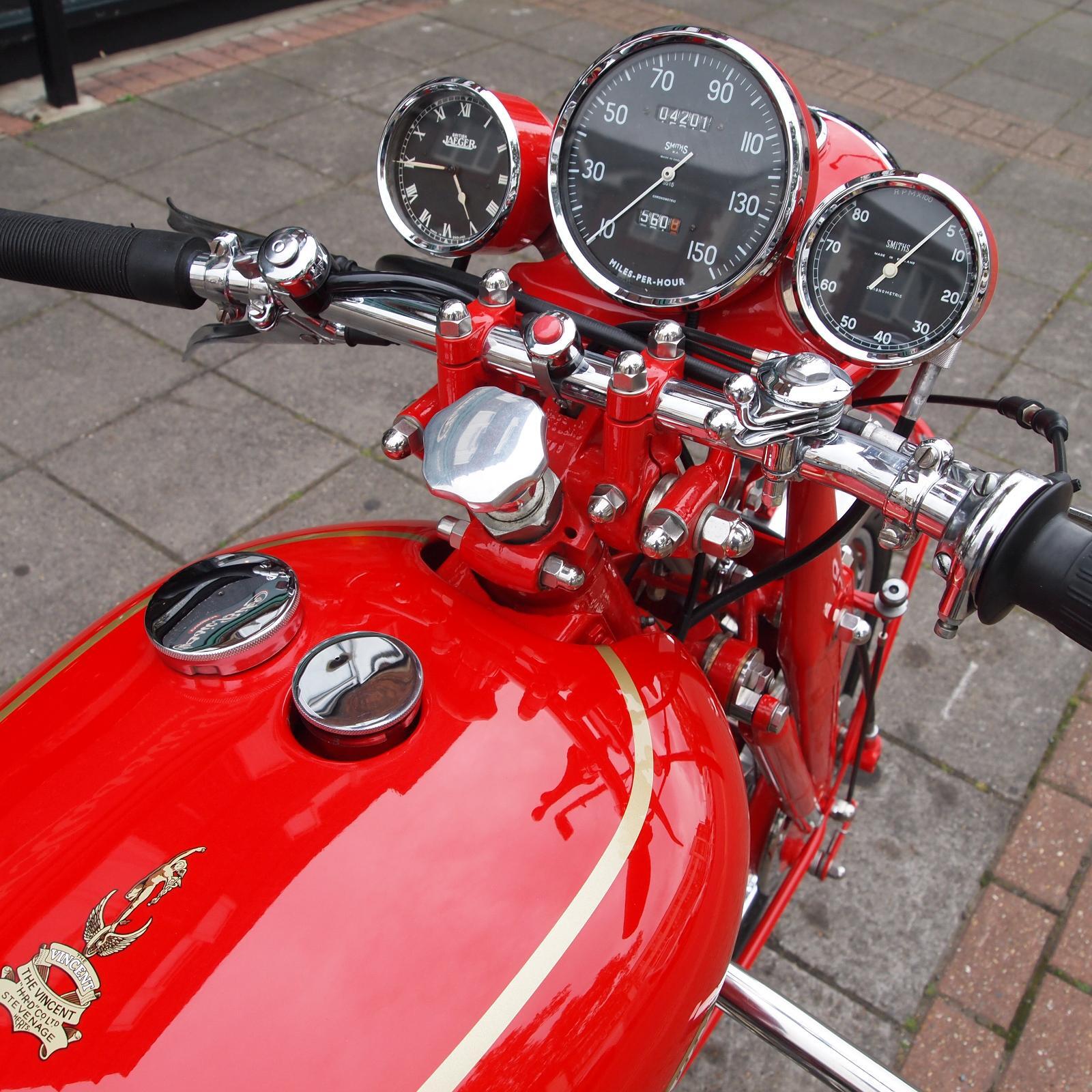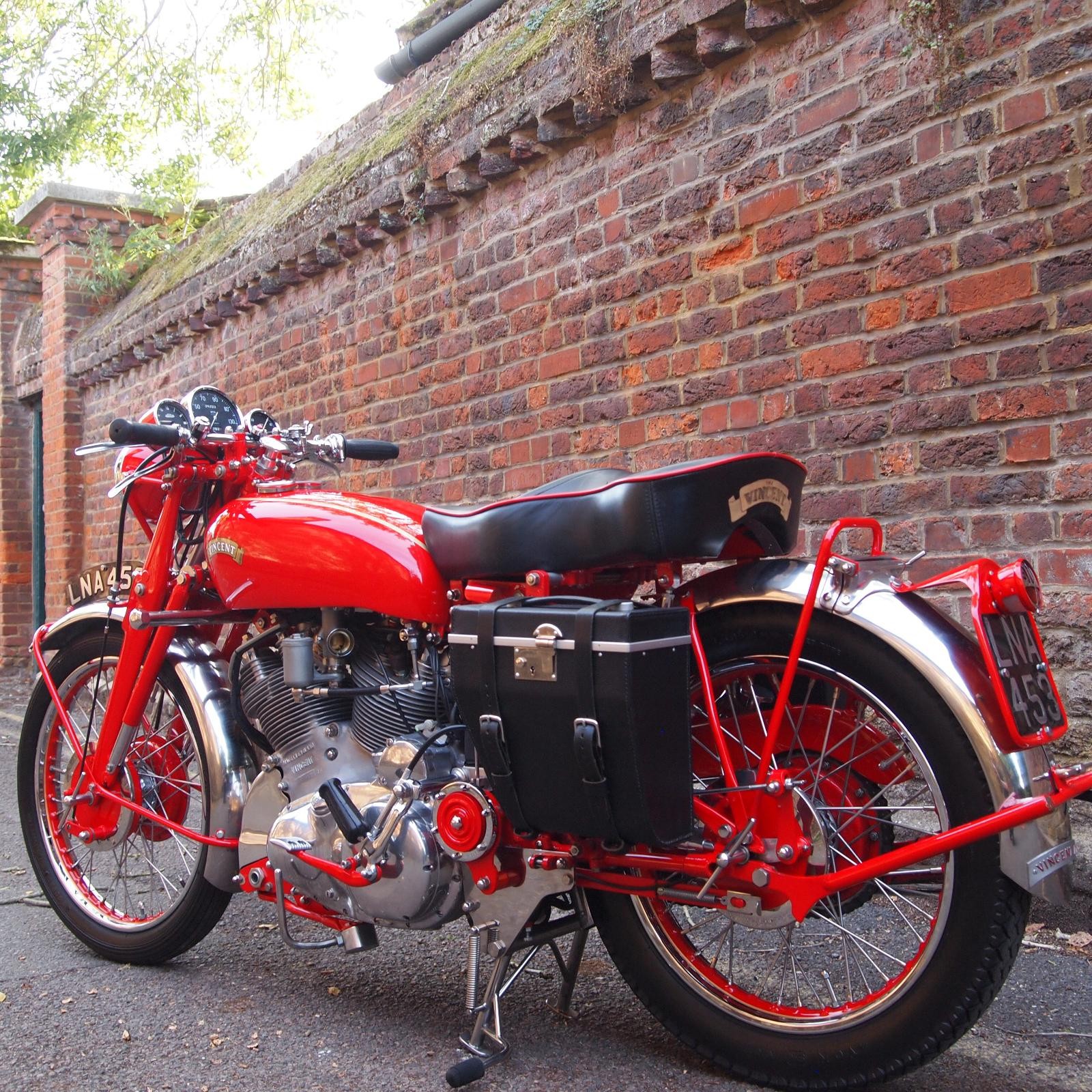 Vincent Rapide 1000cc in Chinese Red, Engine & Frame Numbers correctly 1900 apart with Club Dating Certificate; Buff Card Log Book from 1957; beautifully hand made period style luggage fitted, Rev Counter, Black Shadow Speedometer; really stunning machine and a proper 'eye full' in red.