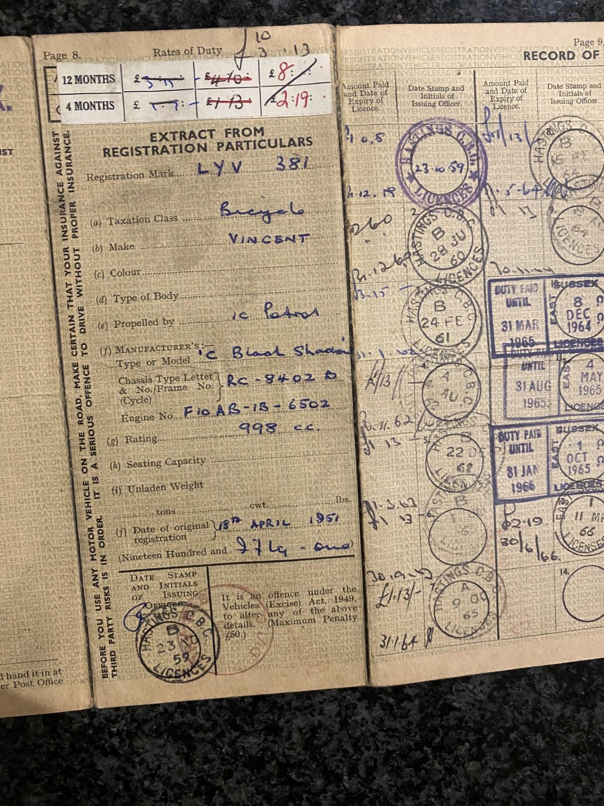 Series: C 998cc Vincent Black Shadow, first registered on 18th April 1951 by Conway Motors Ltd, 301 Goldhawk Road, Shepherds Bush, London, W12