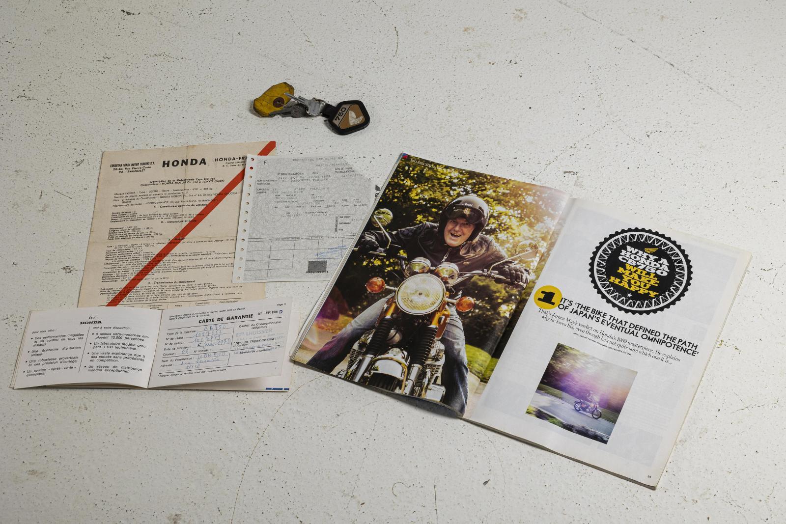 Also in the file is an advertisement detailing the machine's French-market features including: extra lighting cut off switch to left handlebar; rear reflector numberplate holder; right-hand light switch with parking light facility; and longer baffles in the exhaust. There are various French documents on file, including the original guarantee card with supplying dealer's stamp; a Honda France specification sheet dated June 1970; and an old French Carte Grise (1999).